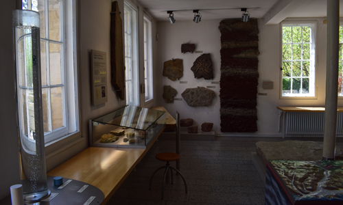 Die Sedimentgesteine sind die Archive der Erde. Sie berichten über die geologischen Ereignisse der Erdgeschichte und ihren zeitlichen Verlauf. Gleich am Eingang der Ausstellung steht ein Modell zum Kreislauf der Gesteine, dahinter eine dreidimensionale geologische Karte von Nordbayern. In den Vitrinen sind die verschiedenen Sedimentgesteine und ihre Verwitterungsformen ausgestellt. Meist sind es Stücke aus der Coburger Keuper-Formation, wobei eine 2 m² große Platte mit Saurierfährten besonders zu erwähnen ist.